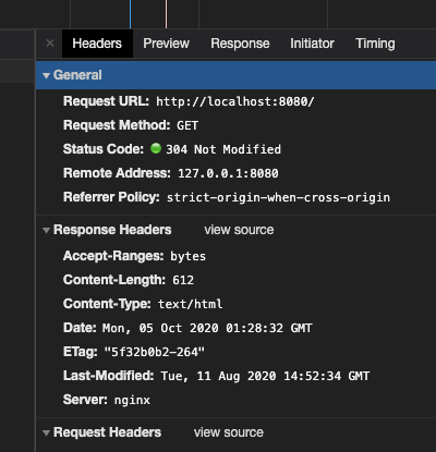 응답 헤더의 Server 정보에 nginx 버전인 1.19.2 사라졌다.